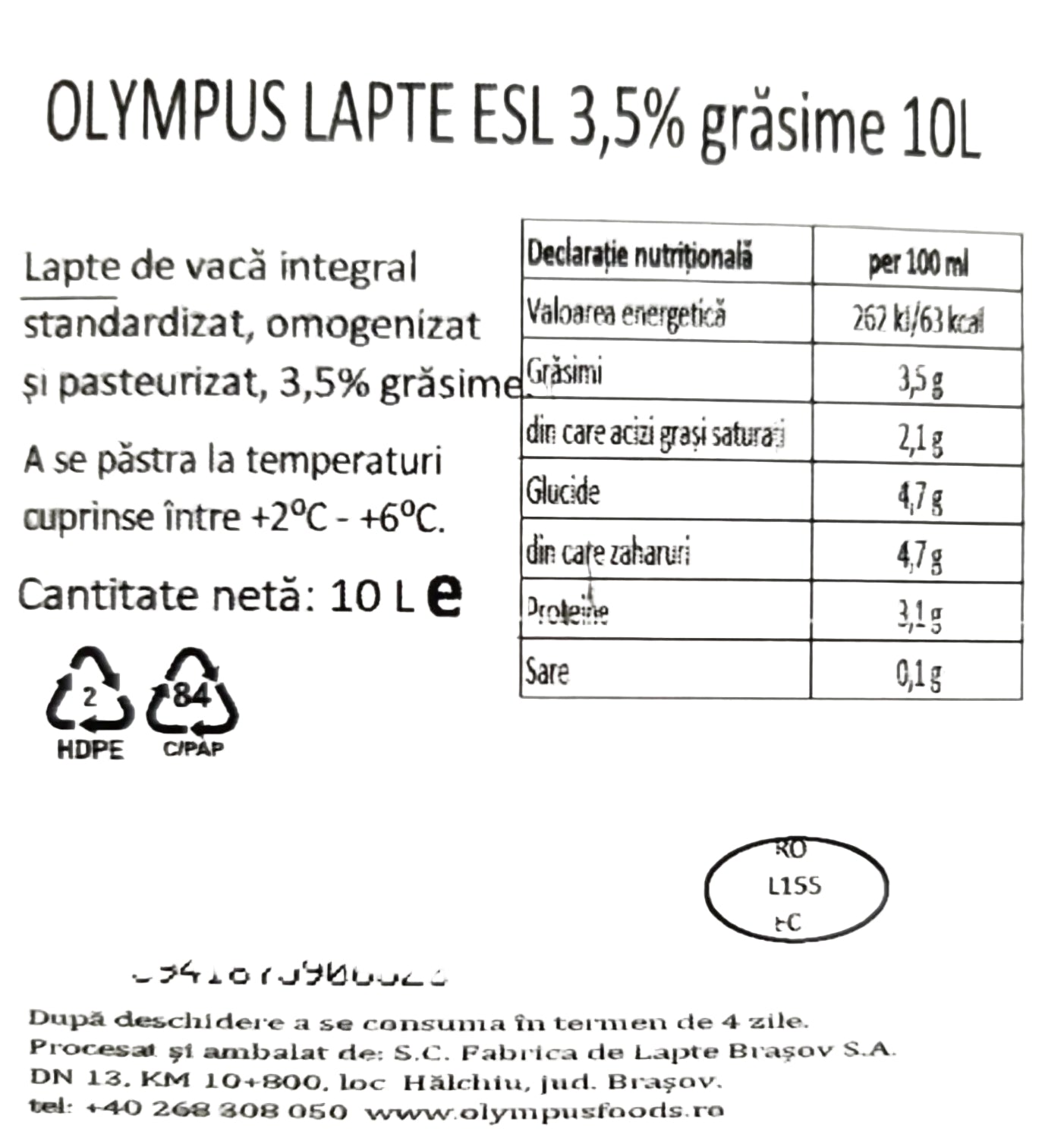 Lapte de vacă integral standardizat, 3,5% grăsime, omogenizat și pasteurizat la temperatură înaltă.
